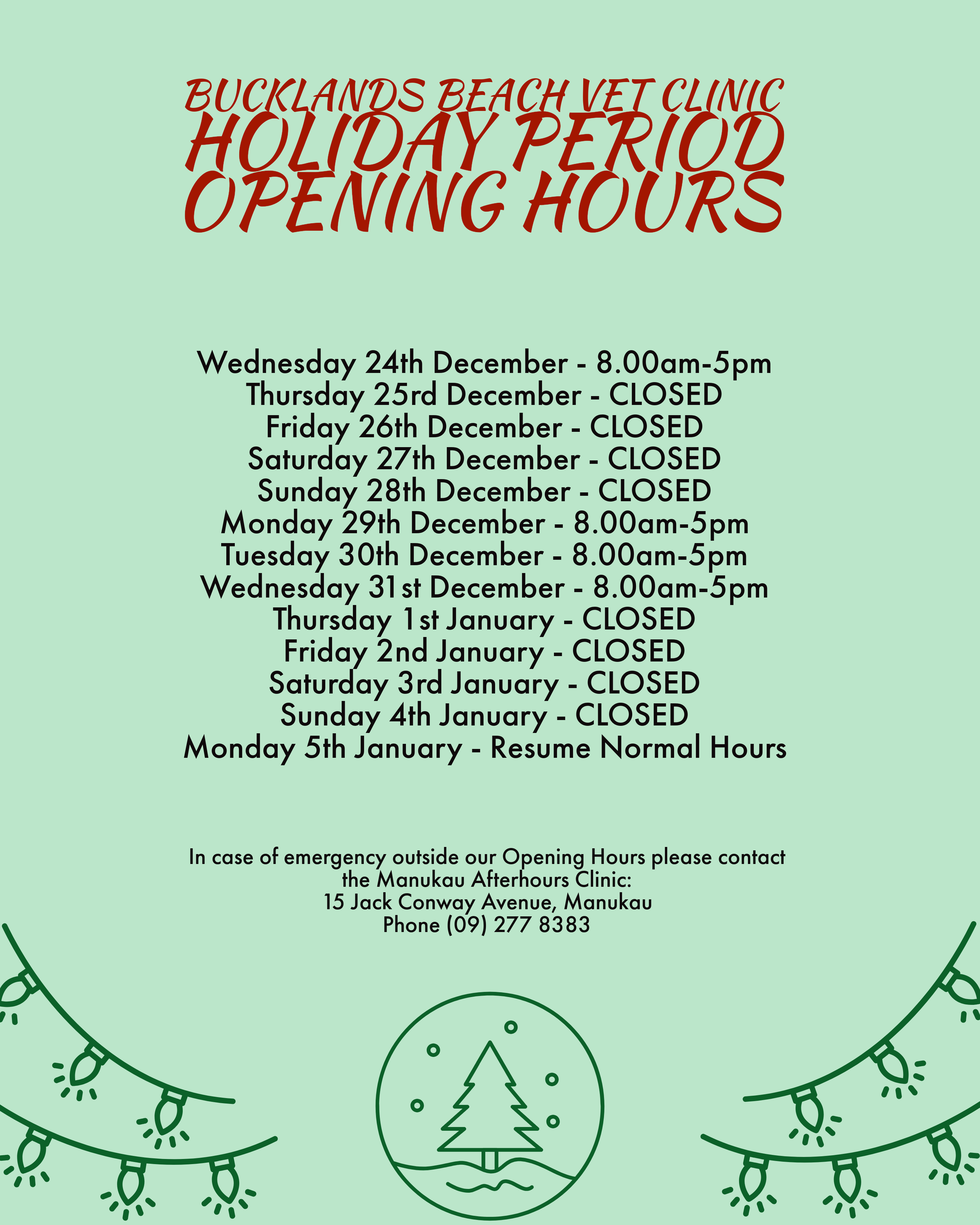 >> In the event of an emergency outside our normal clinic hours, please contact the Manukau Afterhours Vet Clinic on 09 277 8383 <<